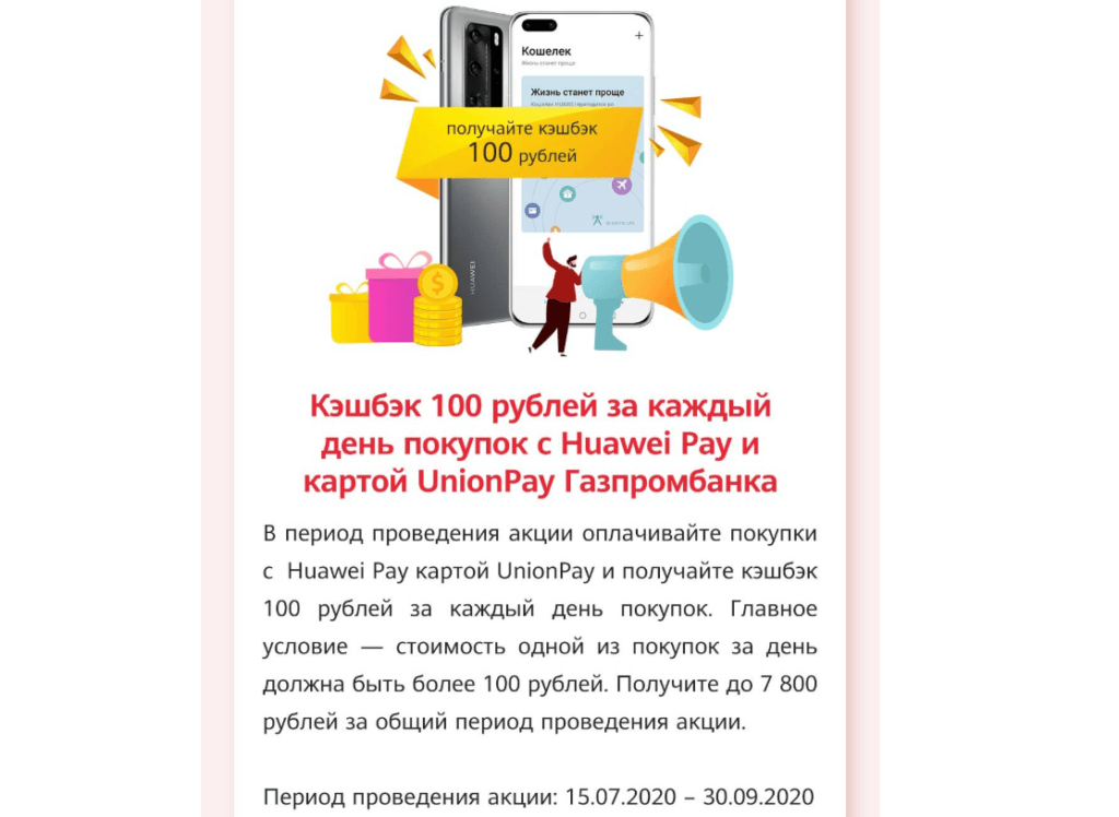 ● «За каждый день, в котором была совершена хотя бы одна покупка через Huawei Pay на сумму от 100 рублей, клиент получит кэшбэк 100 рублей».
