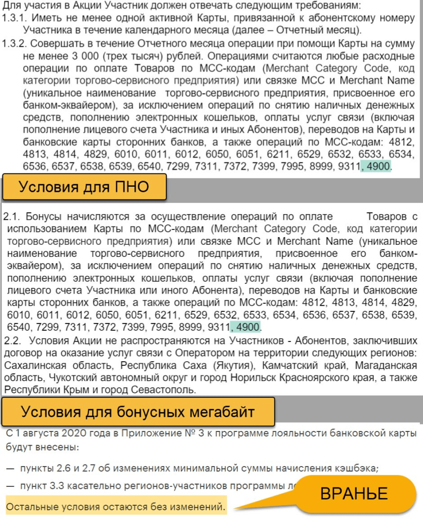 Кроме обнуления кэшбэка для ряда регионов с 1 августа Мегафон внёс другие правки в условия программы лояльности. Теперь mcc-код 4900 не учитывается для начисления процентов на остаток и для начисления бонусных мегабайт (см. прил. 1 и прил. 2).