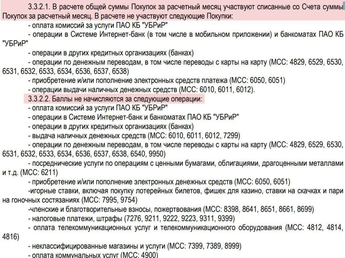 ● Список исключений остался прежний, т.е., что не учитывается для учета оборота по карте: 4829, 6010-6012, 6050, 6051, 6529-6538. ● При этом появился п. 3.3.2.2, список исключений для начисления кэшбэка 1%: 4812, 4814, 4816, 4829, 4900, 6010-6012, 6050, 6051, 6211, 6529-6540, 7276, 7299, 7389, 7399, 7995, 8398, 8641, 8651, 8661, 8699, 8999, 9211, 9222, 9223, 9311, 9399, 9754, 9950. Это важно, т.к. новые клиенты могут первые 2 месяца получать 6% кэшбэка за супермаркеты (макс. 3к) при тратах по карте более 30к/мес.