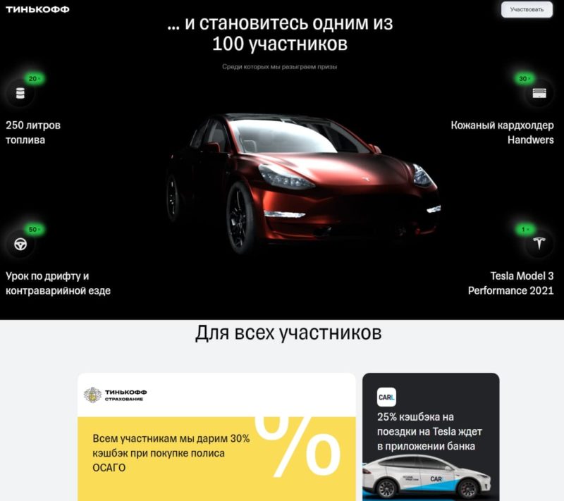 Тинькофф: розыгрыш Tesla Model 3 2021, кэшбэк 30% на ОСАГО