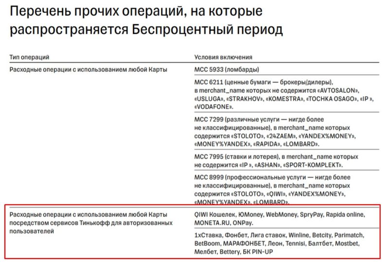 В Перечне прочих операций, на которые распространяется Беспроцентный период по кредитным картам Тинькофф банка в конце июля произошли изменения: