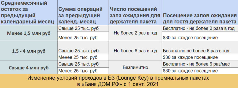Банк «Дом РФ» ухудшает с 1 сентября условия обслуживания в части доступности проходов в бизнес-залы по программе Lounge Key премиальных пакетов.
