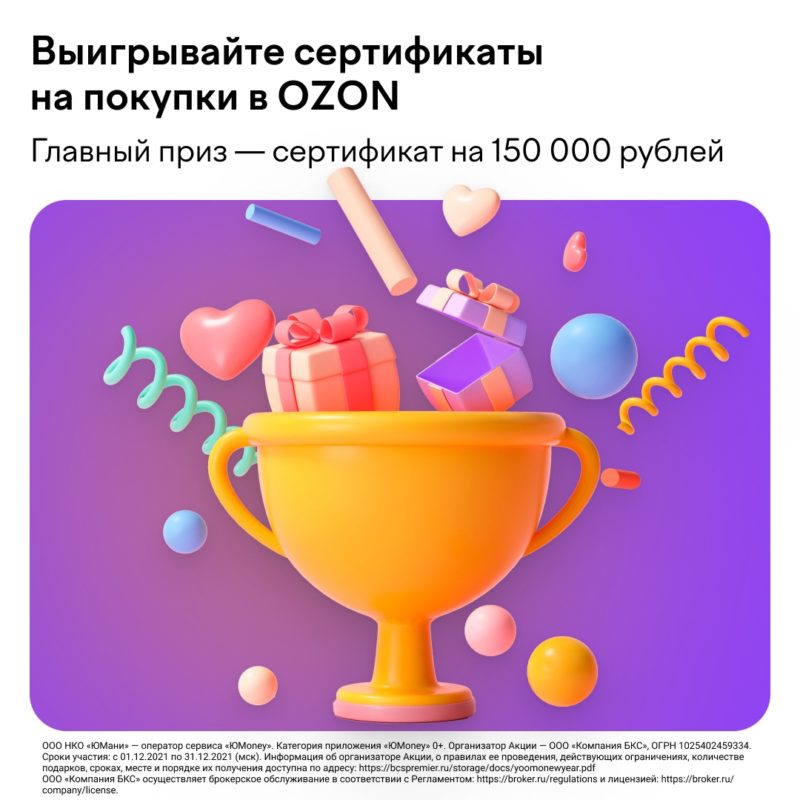 Пополните брокерский счёт в приложении ЮMoney и не выводите деньги до 31 декабря — появится шанс выиграть призы. Для этого нужно приложение ЮMoney — скачайте его в App Store, Google Play. Зайдите в Каталог, перейдите в раздел Сервисы, выберите «БКС Брокер» и откройте счёт. https://promo.yoomoney.ru/bcs_broker