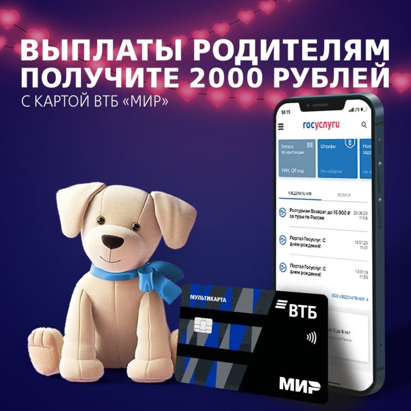 ВТБ: бонус 2000 руб, если получите детское пособие на «Мультикарту» МИР с 01.12.21 по 31.12.21. Сайт банка.
