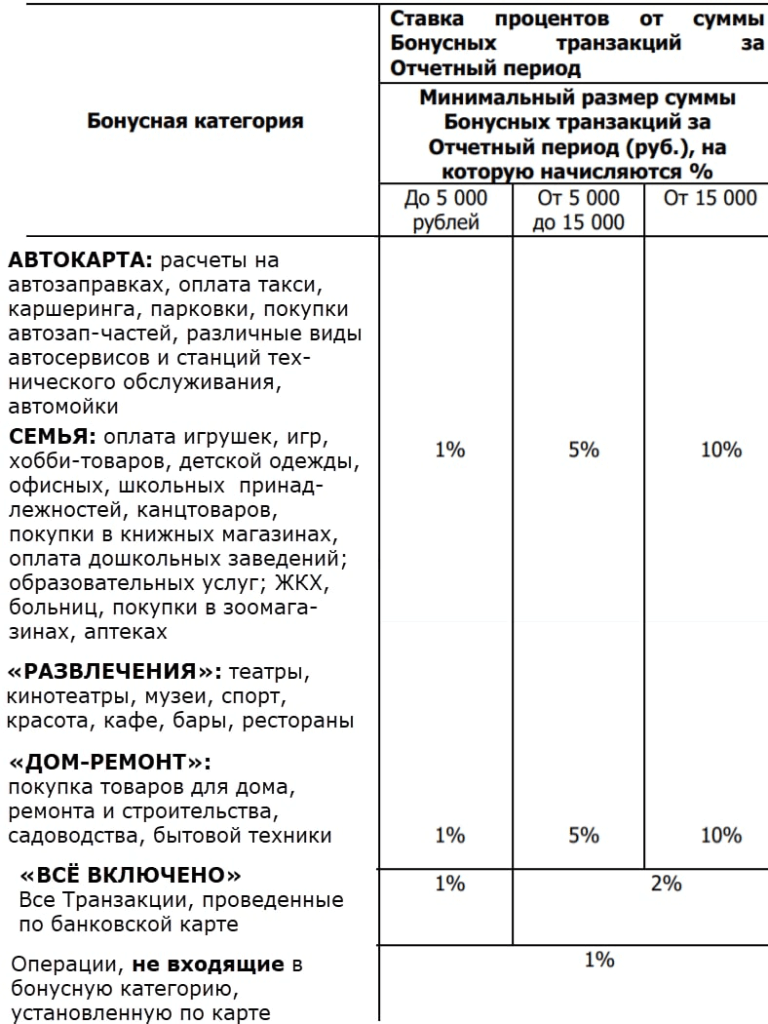 Бонусная программа: ● Начисляется в баллах. Приветственные 200 баллов. Компенсация покупок прошлого месяца по курсу 1б=1₽; ● Максимально 3000 баллов в месяц; ● Стандартный кэшбэк 1%, и надо выбрать одну из 5 повышенных категорий трат: