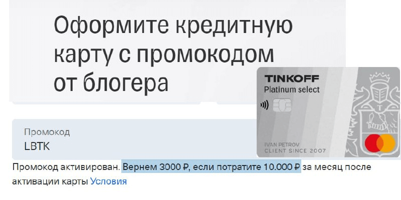 Срок окончания акции не обозначен. Участвовать могут все, в т.ч. действующие клиенты, у кого нет сейчас и не было в течение года договора на кредитную карту.Денежный бонус 3000₽ при покупках на 10 000₽ за месяц. Оформление по спец. ссылке (промокод LBTK подставится автоматически).
