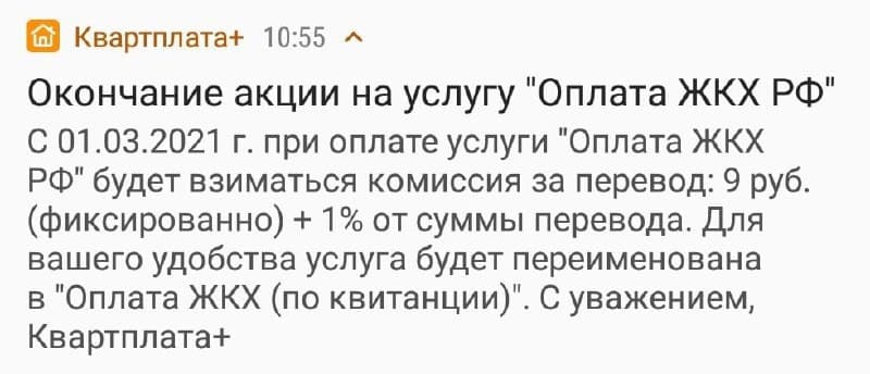 С 1 марта в мобильном приложении «Квартплата+» системы «Город» будет браться комиссия за оплату коммунальных платежей в размере 1%+9 рублей (сейчас бесплатно).