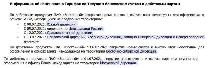 Перед объединением с Совкомбанком банк «Восточный» приостанавливает открытие новых счетов и выпуск карт.