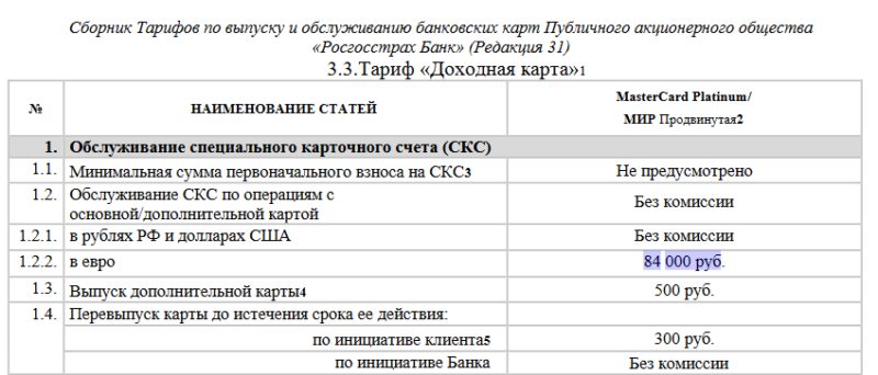 РСГ-Банк в тарифах к «Доходной карте» установил плату за обслуживание счета в евро в 84000 рублей