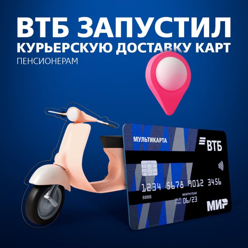 ВТБ запускает курьерскую доставку карт пенсионерам. Теперь клиентам старшего поколения не нужно посещать отделения банка для получения дебетовой карты «Мир» — её можно заказать на дом на сайте ВТБ. Одновременно появляется возможность сразу перевести на неё зачисление пенсии. Курьер доставит карту по удобному адресу, а заявление в Пенсионный фонд о переводе пенсии в ВТБ сформируется автоматически. После подтверждения клиентом ПФР рассмотрит заявку и переоформит выплаты.