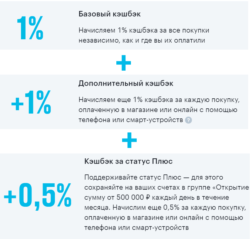 Если есть статус «Плюс» (дается при остатках на счетах от 500 тыс. руб), то будет надбавка 0,5% при оплате телефоном (т.е. максимум можно получать 2,5%). Если есть премиум, то последняя прибавка +1% (также при оплате пэем), т.е. максимум итого 3%.