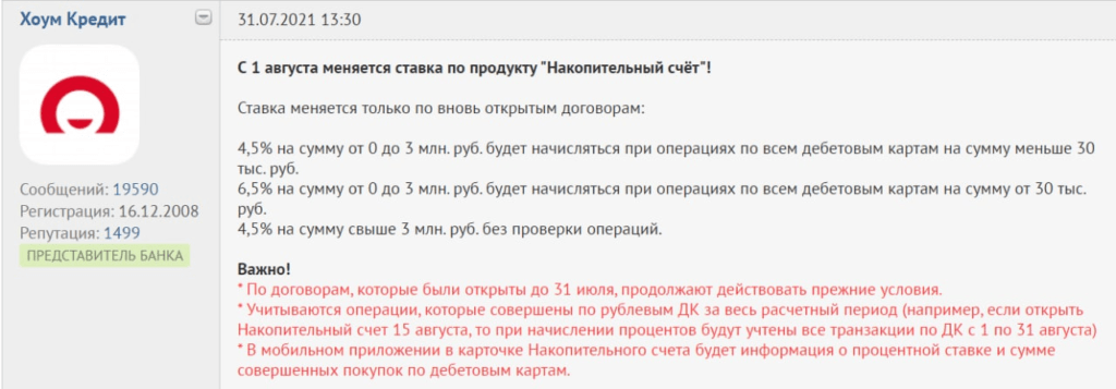 Вчера утренние пташки среди клиентов «Хоума» подняли бурю возмущений увидев на своих накопительных счетах 4,5% годовых вместо 5,5%.