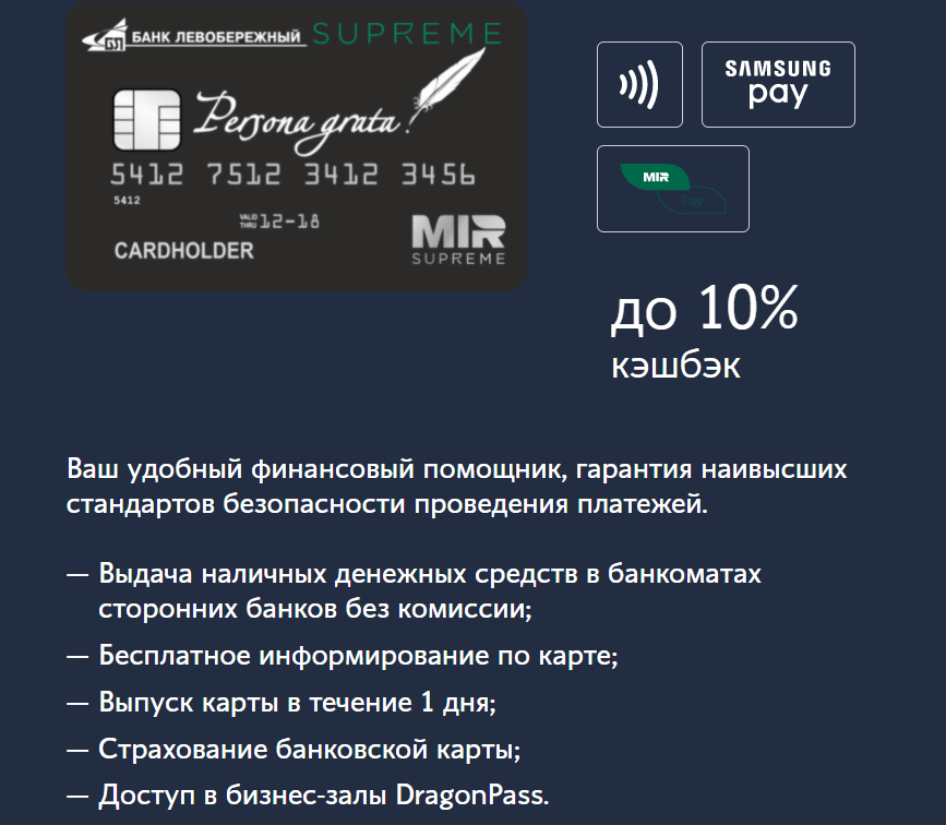 «МИР Supreme» от Левобережного интересна как продукт с хорошим кэшбэком, а премиальное обслуживание интересно в части бесплатности за 1 млн рублей на счетах (ставки по вкладам относительно высокие). Но с документами на сайте бардак и хаос, много чему нет подтверждения.