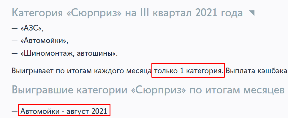 И есть еще кэшбэк-сюрприз, по своей сути похожий на лотерею. На июль-сентябрь даны 3 категории: «АЗС», «Автомойки», «Шиномонтаж, автошины». По итогам месяца банк определяет, по какой из категорий начислять кэшбэк 10%, за август это оказались автомойки. Кроме того, выплату кэшбэка банк производит при условии минимум 15 покупок за месяц и если был хотя бы один вход в мобильное приложение. Лимит выплаты: мин. 250 ₽, макс. 5000 ₽.