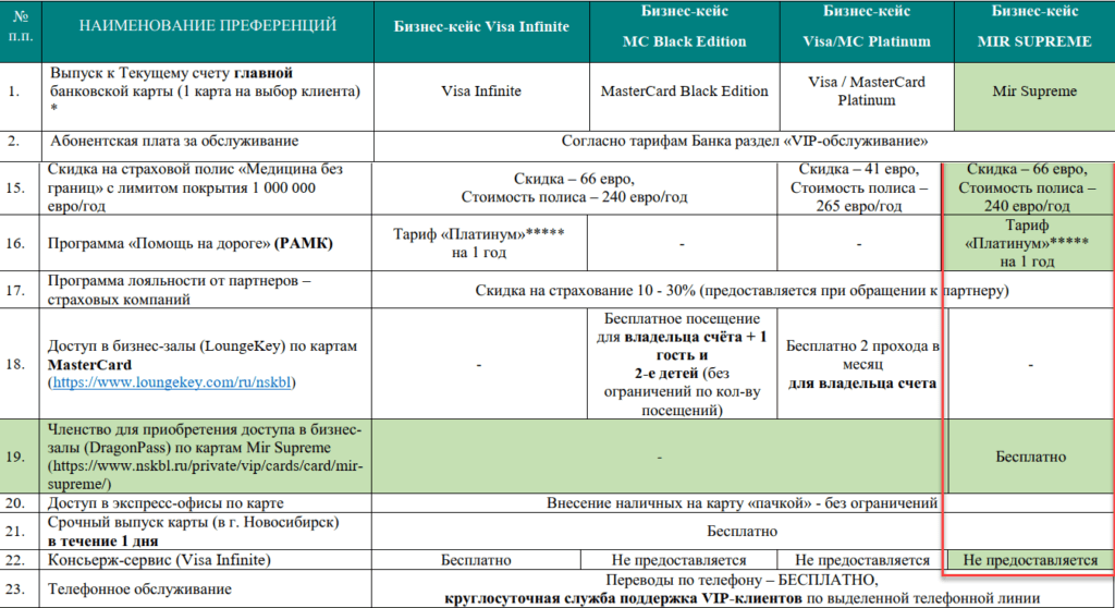 ● Привилегии банка предоставляются в рамках «бизнес-кейса» (так здесь называют премиальный пакет услуг), по которому есть срочный выпуск карты в течение дня в Новосибирске, платиновый тариф «Помощь на дорогах», платная страховка со скидкой. Отсутствует коньсерж-сервис, межбанк платный, но со скидкой, ставка на ипотеку на 0,5% ниже. Упомянут доступ к бизнес-залам по программе Dragon Pass, но без уточнения стоимости проходов. Если сравнить стоимость обслуживания с Black Edition, то можно предположить, что будет безлимит (себе, жене и 2 детям), но т.к. ничего не указано, то проходы могут и вполне стоит $30.