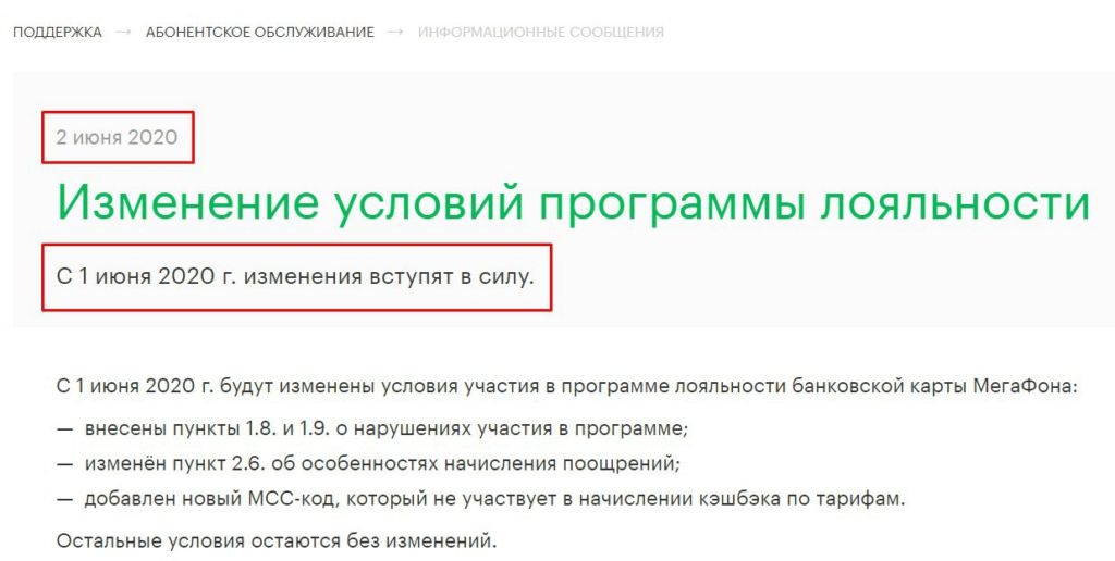 Update. Мегафон ̶с̶п̶а̶л̶и̶л̶с̶я̶ извинился и установил новый срок вступления в действие Условий программы лояльности (https://bank.megafon.ru/documents/loyalty/detail): с 1 июня (задним числом) на 5 июня.