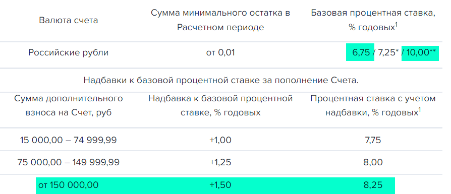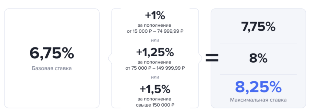 Если под условия не подпадаете, то минимально возможная ставка по НС — 6,75%, максимальная ставка в 8,25% достигается с помощью небольших манипуляций: с 1 по 10 число включительно пополняете баланс НС на 15-150 тыс. руб.