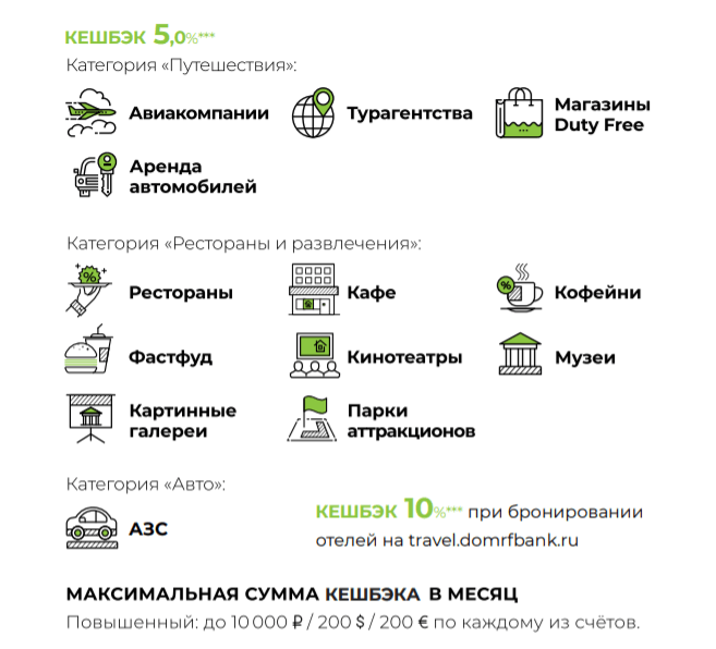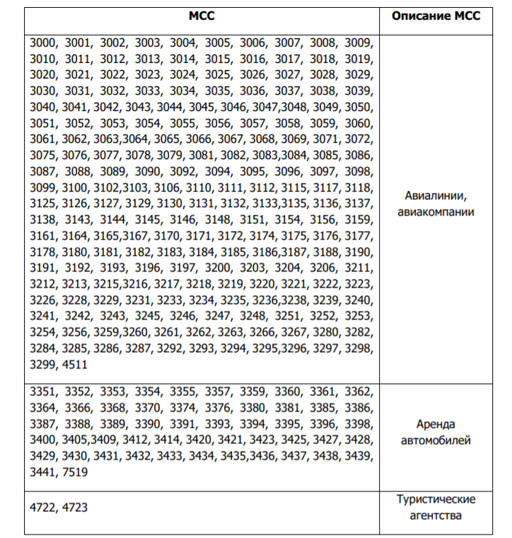 ● Кэшбэк 5% в нескольких категориях: «Авто» (только АЗС — mcc 5541, 5172 , 5983, 5542, 9752); «Рестораны и развлечения» (кино, театры, музеи, аттракционы, кафе-рестораны: 5462, 5811-5814, 7829, 7832, 7833, 7841, 7911, 7922, 7929, 7932, 7933, 7941, 7991-7994, 7996-7999); «Duty Free» (5309); «Аренда автомобилей»; «Туристические агентства» (4722, 4723); «Авиакомпании» (много кодов).