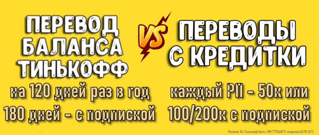 С кредитных карт Тинькофф Банка можно сделать «Перевод баланса» — услуга позволяет делать перевод на 150 000₽ по номеру карты или на 300 000₽ по реквизитам счёта на льготный период 120 дней. С подпиской PRO — 180 дней.