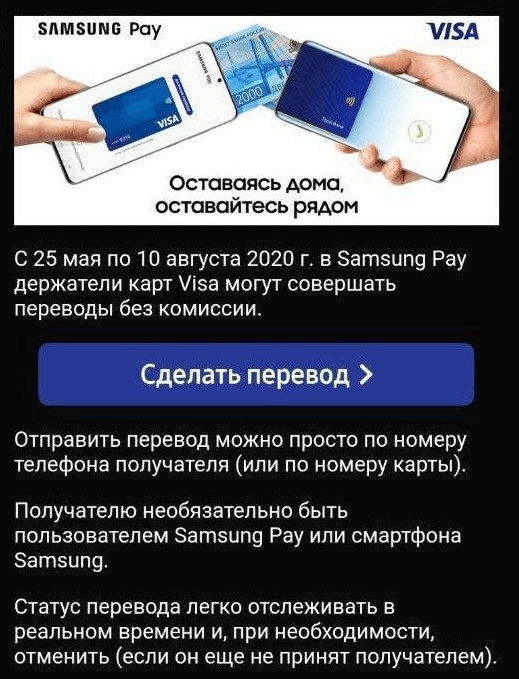 Денежные переводы с карт Visa бесплатны через приложение Samsung Pay с 25 мая по 10 августа 2020 года.