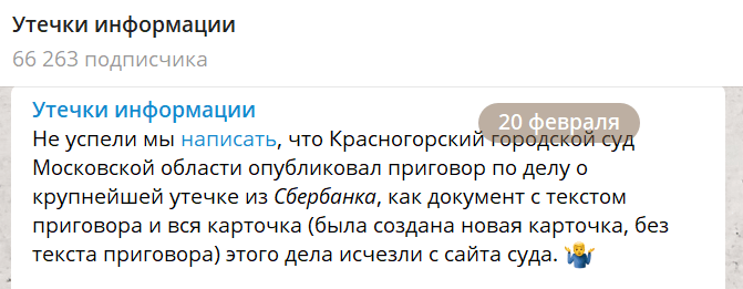 Осенью 2019 было заявлено об утечке данных клиентов Сбера, банк заявил тогда о несущественном инциденте. Через год начальник сектора управления прямых продаж Московского банка Сбербанка Сергей Зеленин, который и допустил утечку, получил срок почти 3 года и иск на выплату штрафа более 25 млн руб.