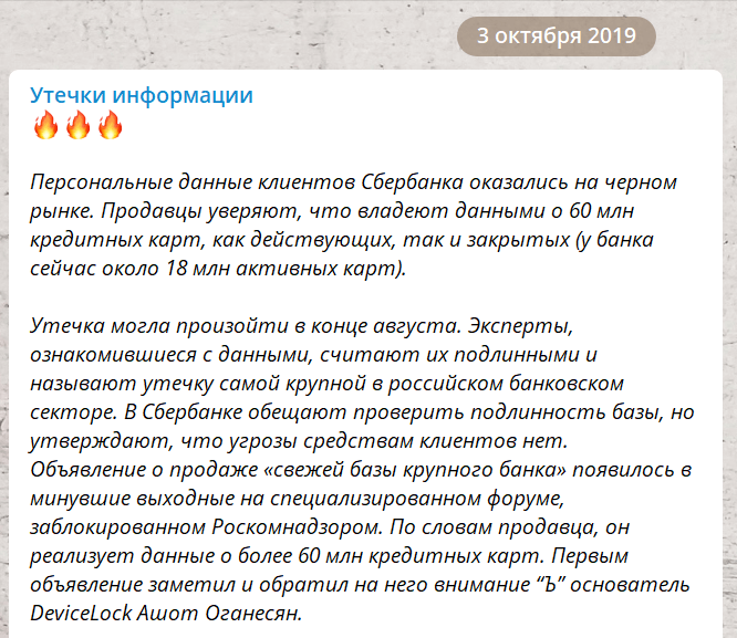 Резюмируя. Сотрудник банка слил громадную базу клиентов — с персональными данными, с данными карт. Сбер отрицал факт утечки, потом нехотя признавал то, что невозможно было не признать.
