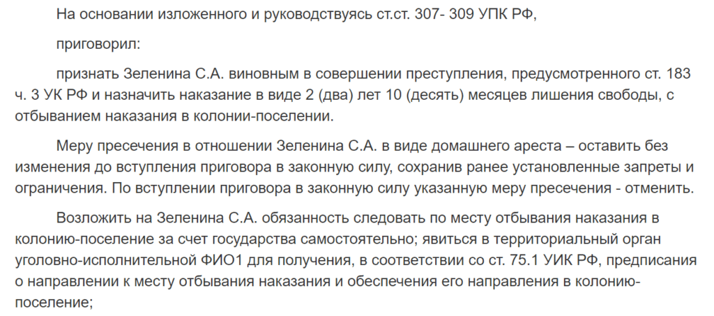 В сентябре 2020 года Зеленин получил 2 года 10 месяцев в колонии-поселении (срок был снижен на 2 мес из-за месячного домашнего ареста).