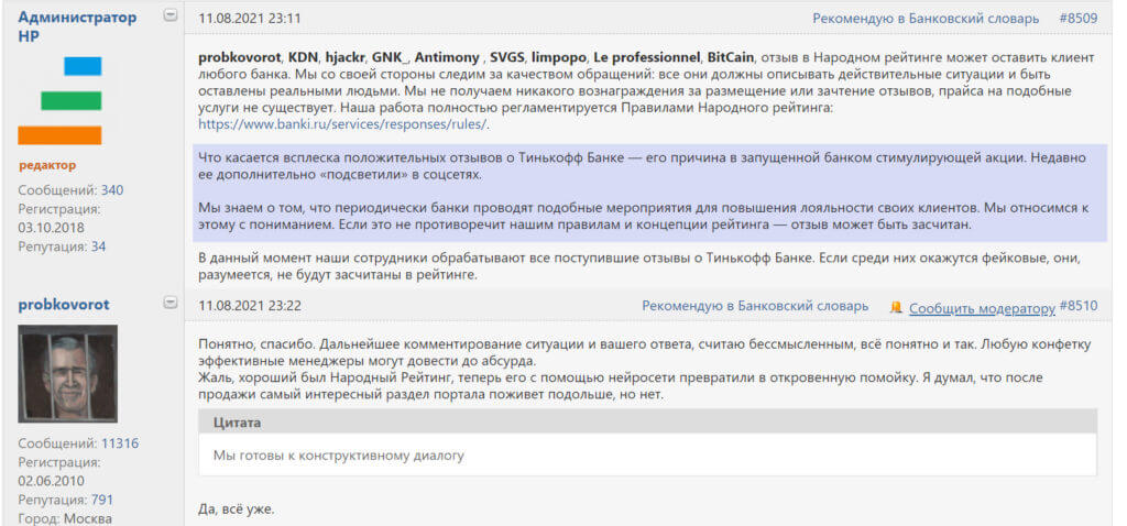 Да и как оказалось, администрация банки.ру в курсе ситуации и Тинькофф подтверждает, что люди реальные: