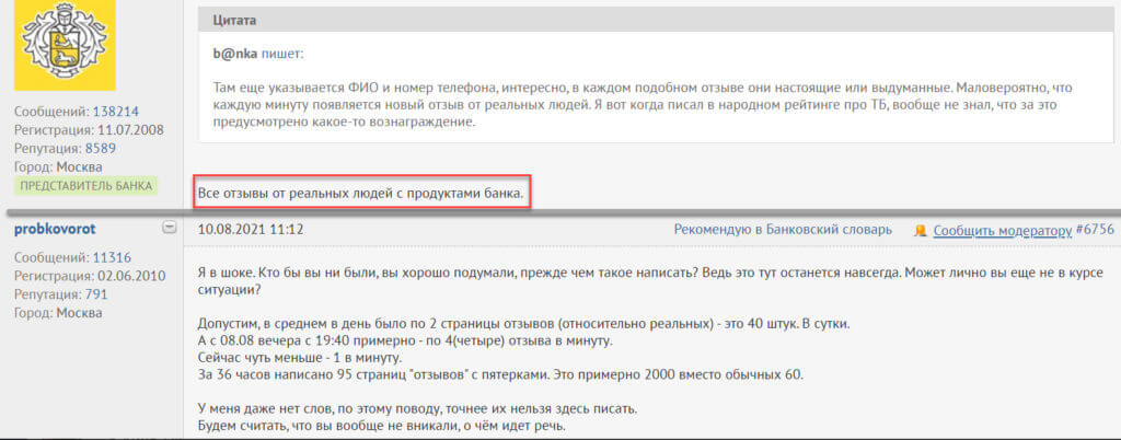 Возможно, что такой нагон отзывов Тинькофф Банку — это что-то вроде чёрного пиара, с целью дискредитации и исключения из рейтинга. Но банки.ру не будут исключать своих спонсоров: те платят кругленькую сумму за своё присутствие на портале в виде официальных представителей банков. Дискредитация? Ну побухтят другие банкиры и обыватели и забудут.
