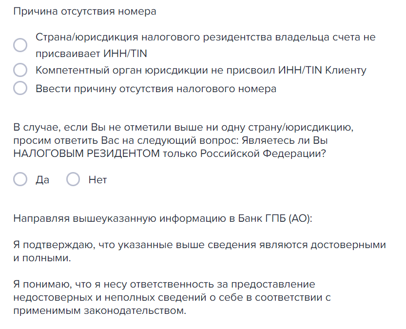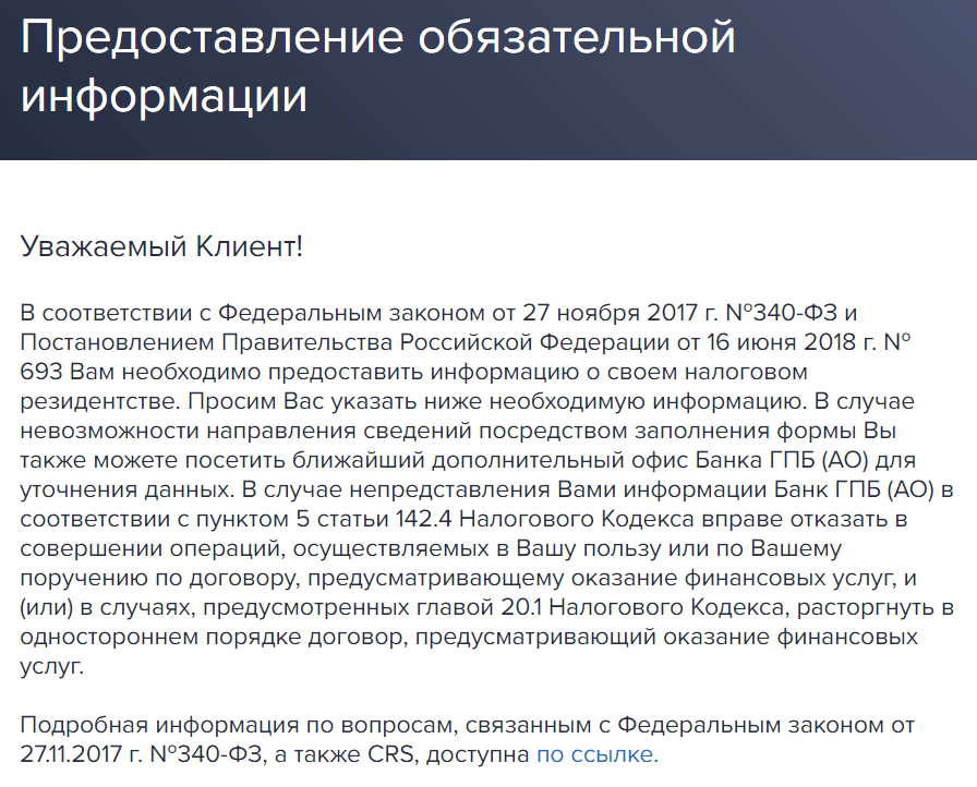 Иван Иванович, в соответствии с Законом № 340-ФЗ у Вас отмечены признаки иностранного налогового резидентства. Пожалуйста, обратитесь в любой офис Банка либо укажите необходимую информацию по ссылке gazprombank.ru/express/crs/… (тут идентификатор личной ссылки). Банк ГПБ (АО).