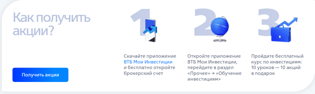 Итак, что нужно: ● Иметь карту ВТБ (дебетовая Мультикарта бесплатная). ● Скачиваете приложение «ВТБ Мои инвестиции», авторизуетесь, открываете брокерский счёт, он должен быть открыт впервые с 01.06.2021 по 30.06.2022.