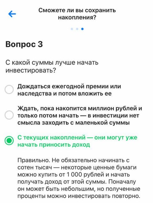 Урок 9 1. Допустим вы узнали, что компания придумала новую вакцину и обещает рост выручки. Все стали ее покупать. Что вы будете делать? б) Спешить не буду, сначала присмотрюсь к бизнесу 2. Вы получаете доход с купонов и дивидендов, например 10000 рублей в месяц. Как их правильно использовать, чтобы получить максимальный доход от инвестиций? а) Буду реинвестировать 3. В какой из предложенных ситуаций лучше начать инвестировать? б) Есть финансовая подушка, нет кредитов