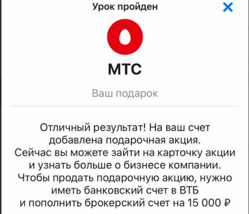 Отзыв от подписчика: Проверил на «вшивость» брокера ВТБ, делюсь личным опытом: получил 2300 руб. Мелочь, а приятно) Подарочные акции продал, получил живые деньги. У кого есть свободный вечер и кто новый клиент рекомендую. P.S. Чтобы продать виртуальные подарочные акции нужно завести на счёт 15 тыс. руб и подождать 2 дня.